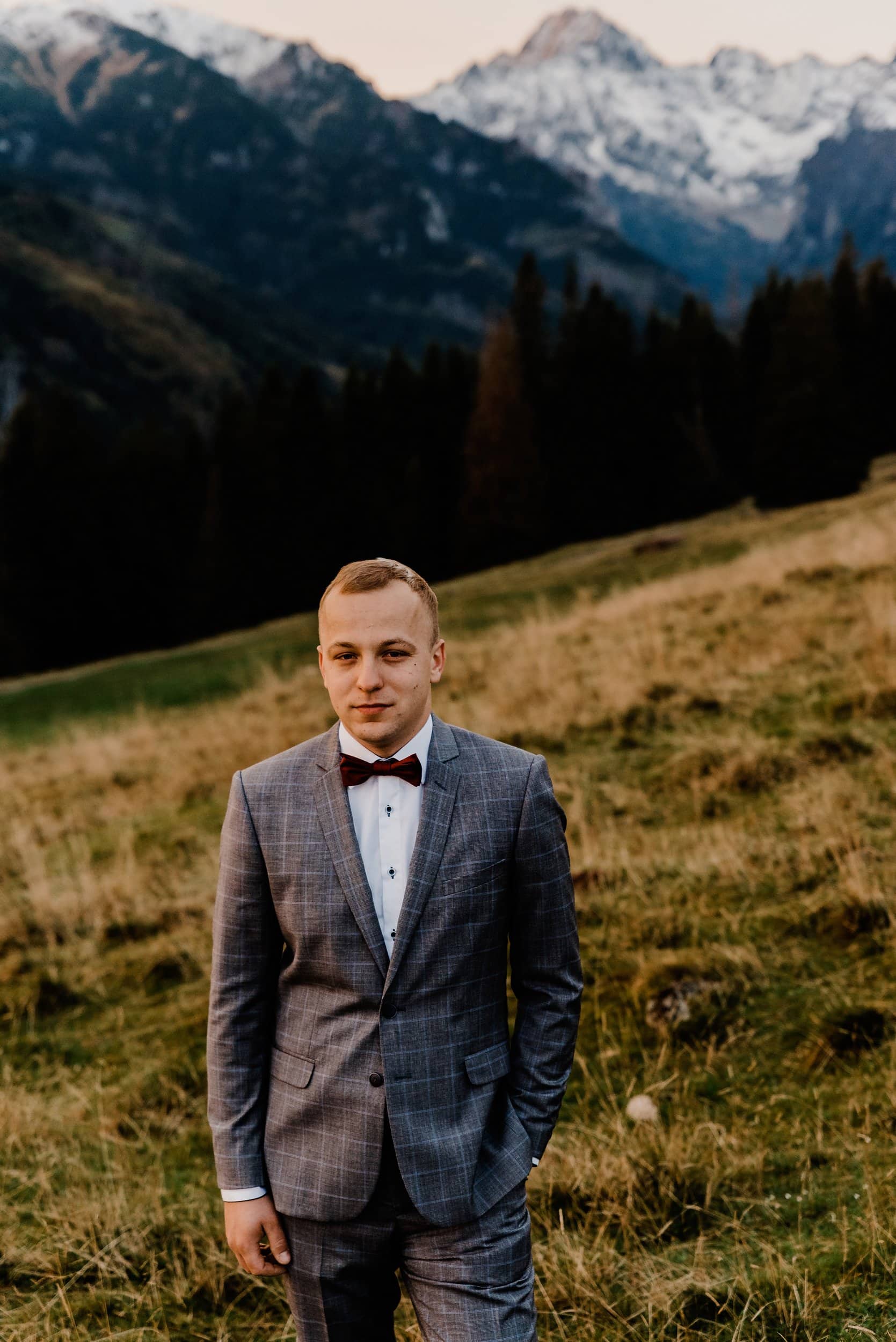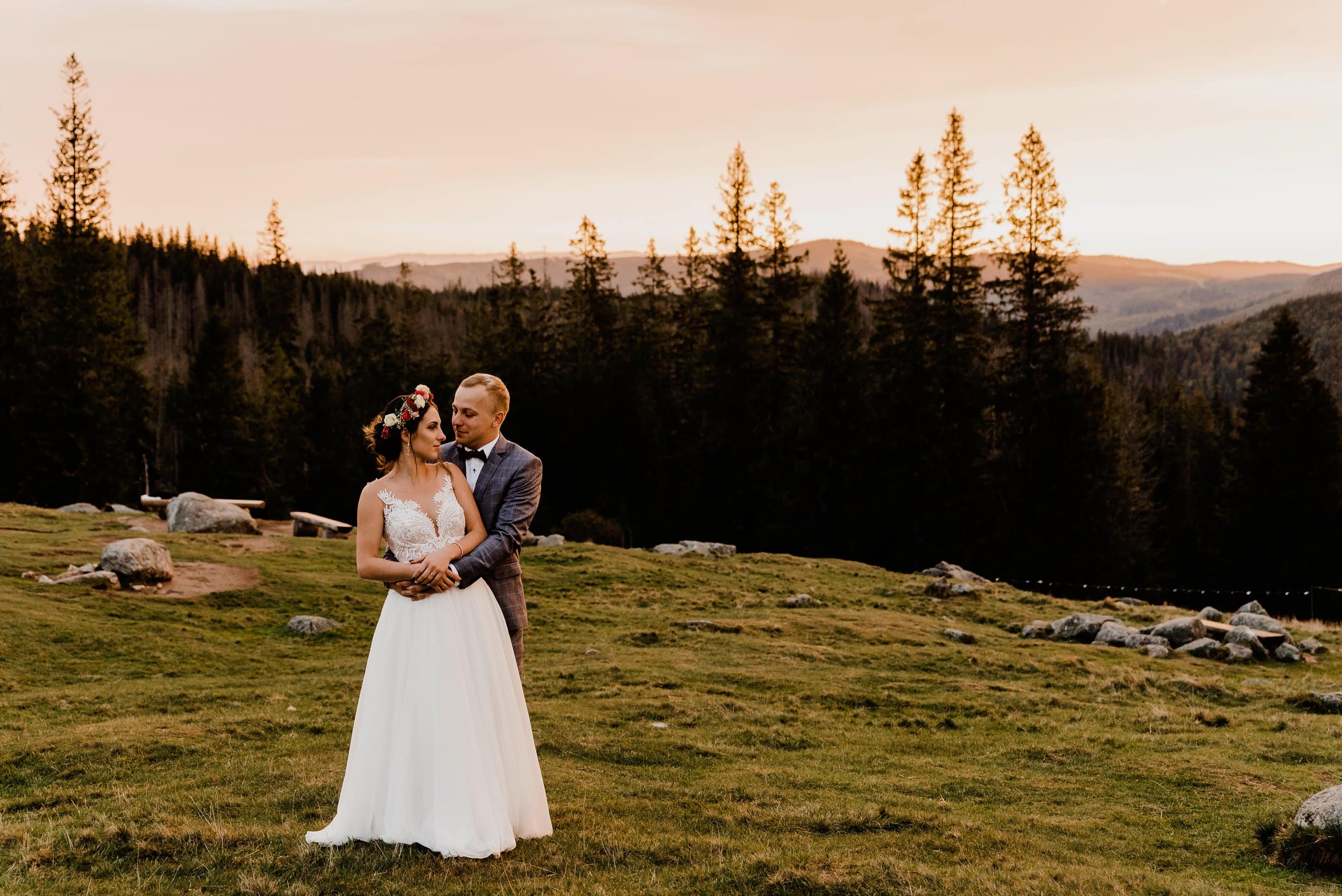 Już od pierwszych chwil było jasne, że trafiliśmy w dziesiątkę. Złote światło otulało polanę, delikatny wiatr poruszał trawę, a góry w oddali wyglądały jakby zostały wyciągnięte z pocztówki. Edyta i Piotrek byli zachwyceni – lekkie podejście, cudowne światło i krajobraz, który zapierał dech w piersiach.