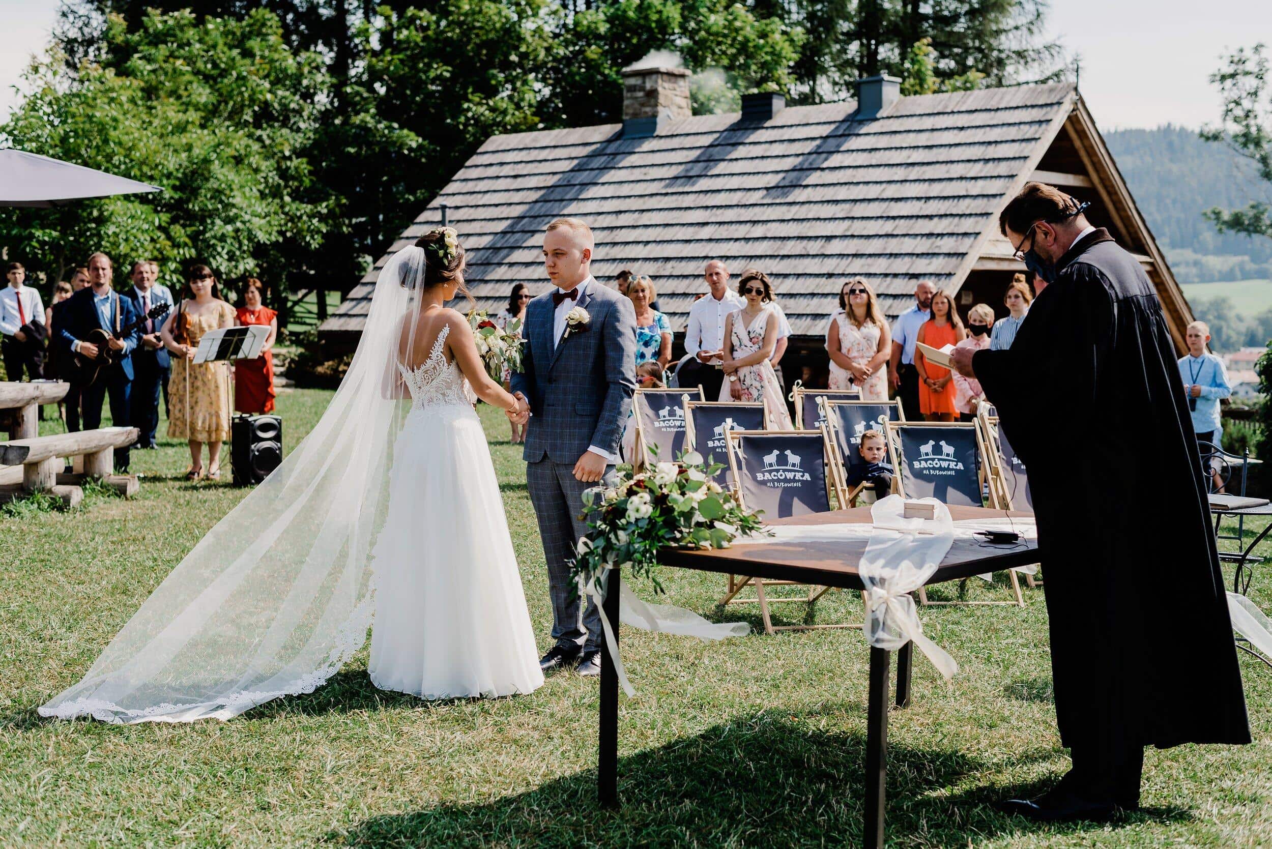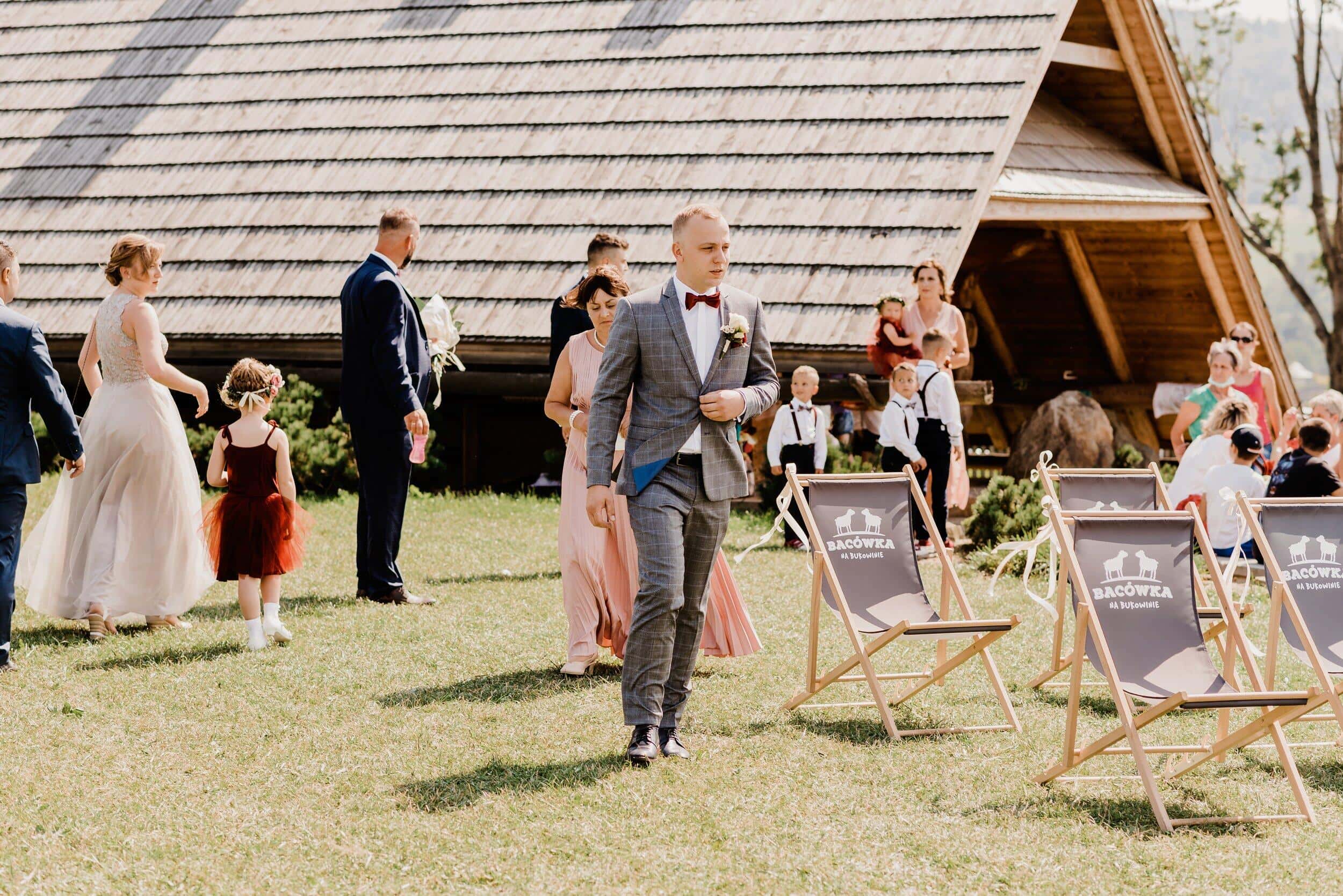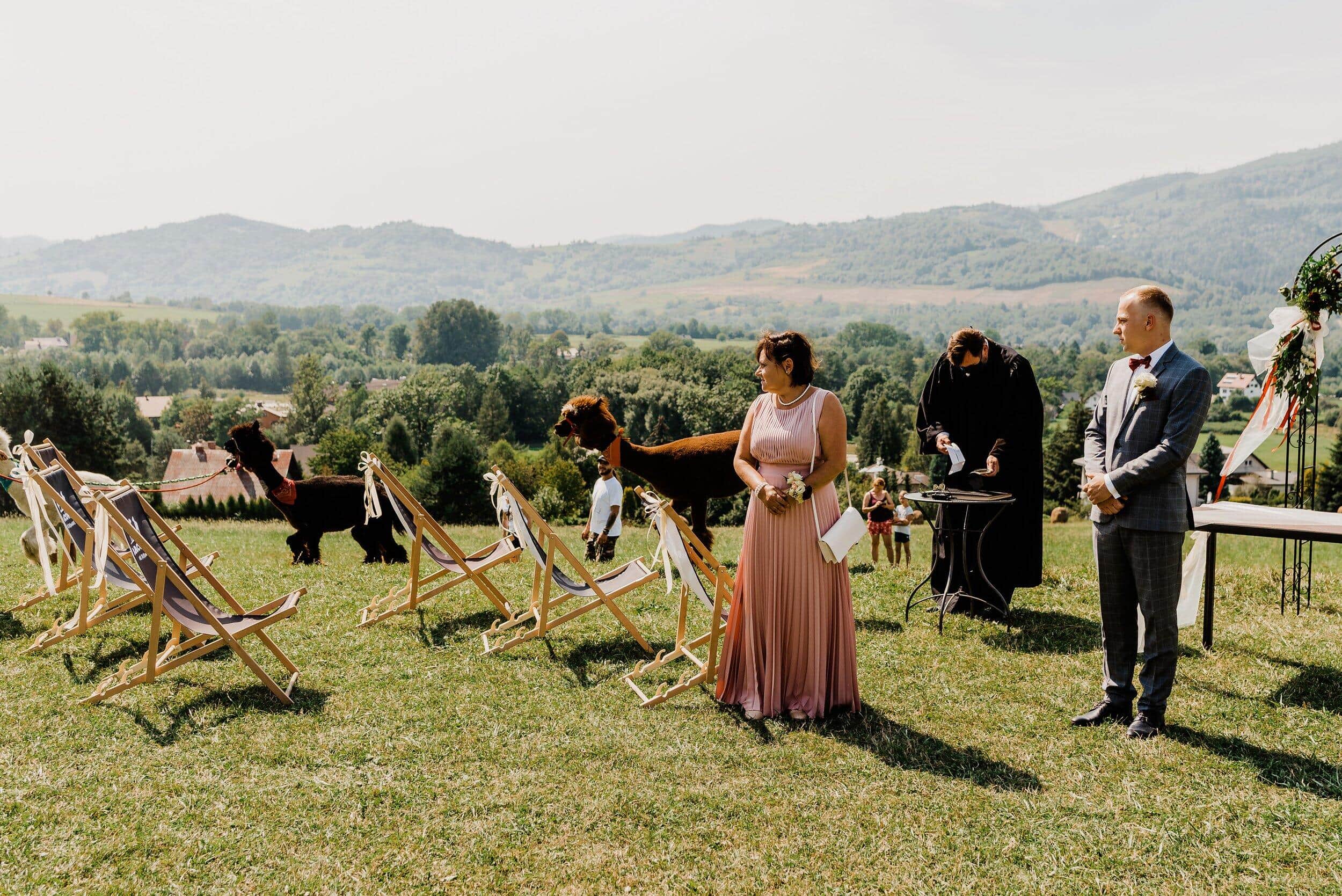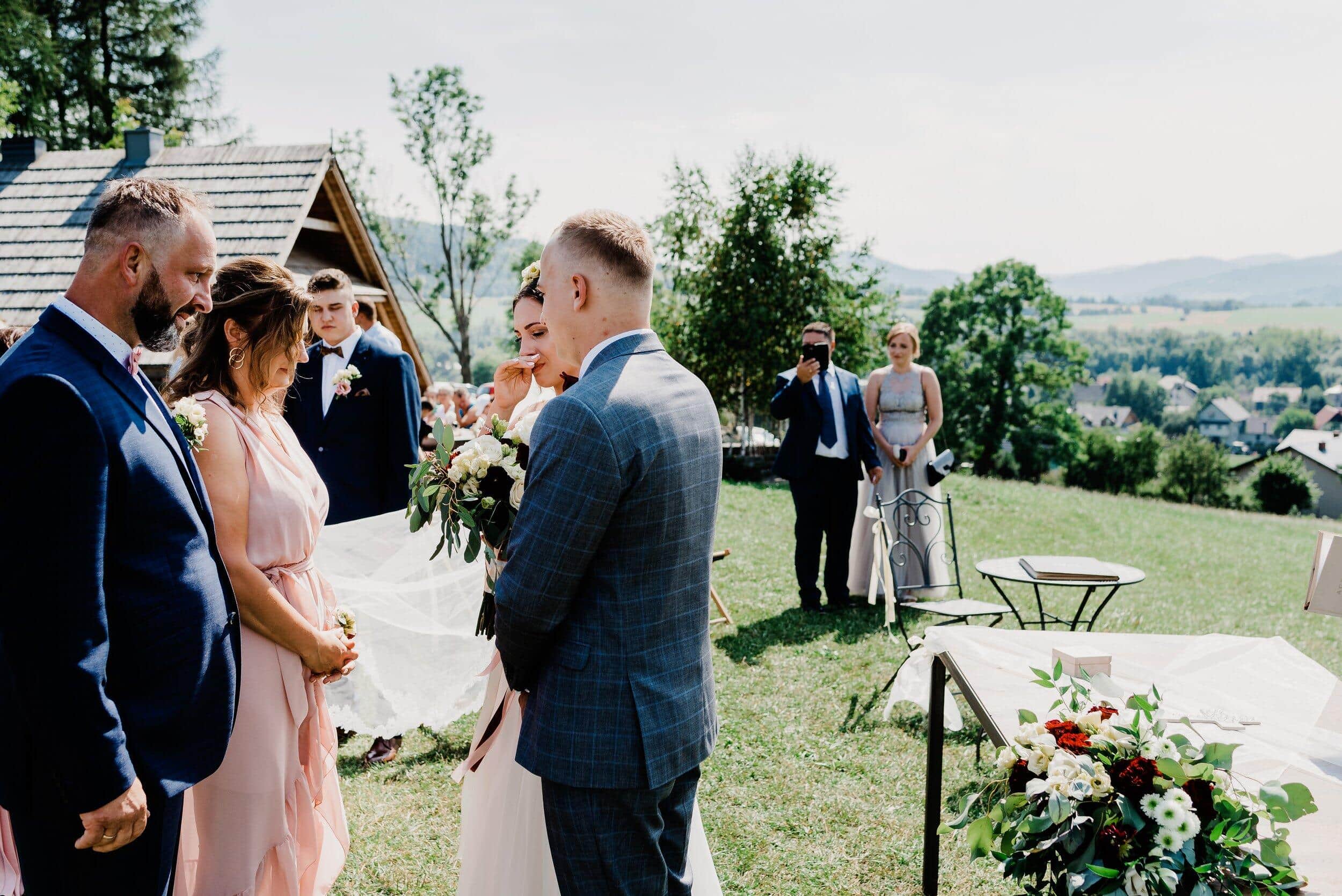 Ceremonia odbyła się na malowniczej polanie przy bacówce w Węgierskiej Górce. Miejsce zapierało dech w piersiach – zielone wzgórza, szczyty i niebo. Delikatny wiatr poruszał welon Edyty, unosząc go jak mgiełkę. Piotrek stał na tle gór, patrząc na nią, jakby właśnie widział spełniające się marzenie. W powietrzu unosił się zapach trawy, a w tle słychać było jedynie szum wiatru i cichy śpiew ptaków.