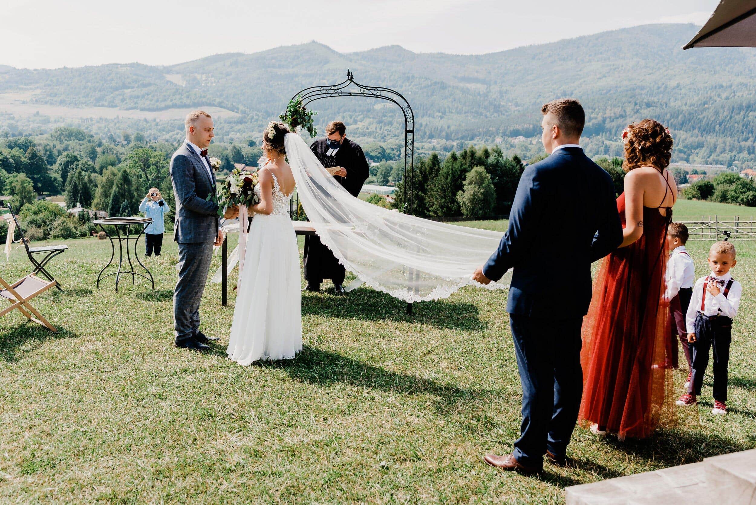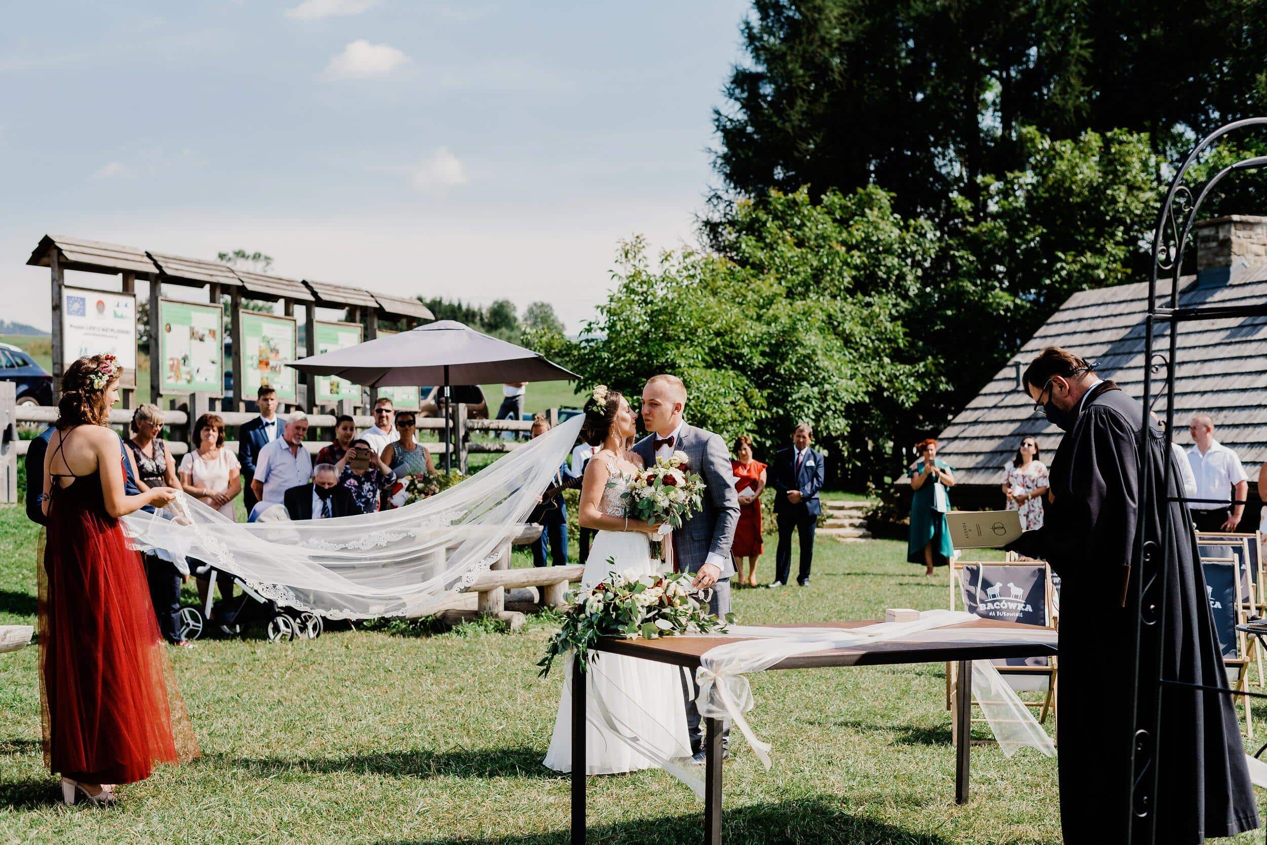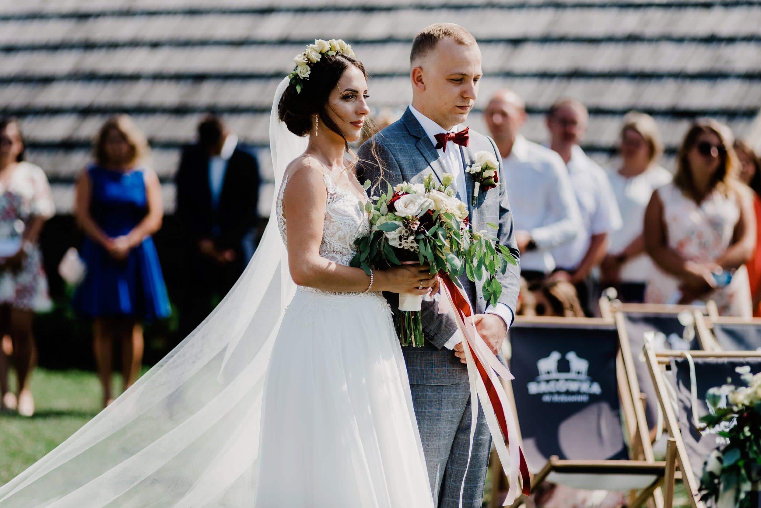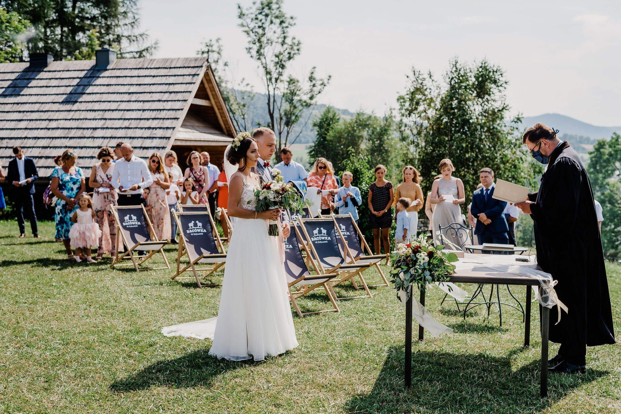 Ceremonia odbyła się na malowniczej polanie przy bacówce w Węgierskiej Górce. Miejsce zapierało dech w piersiach – zielone wzgórza, szczyty i niebo. Delikatny wiatr poruszał welon Edyty, unosząc go jak mgiełkę. Piotrek stał na tle gór, patrząc na nią, jakby właśnie widział spełniające się marzenie. W powietrzu unosił się zapach trawy, a w tle słychać było jedynie szum wiatru i cichy śpiew ptaków.