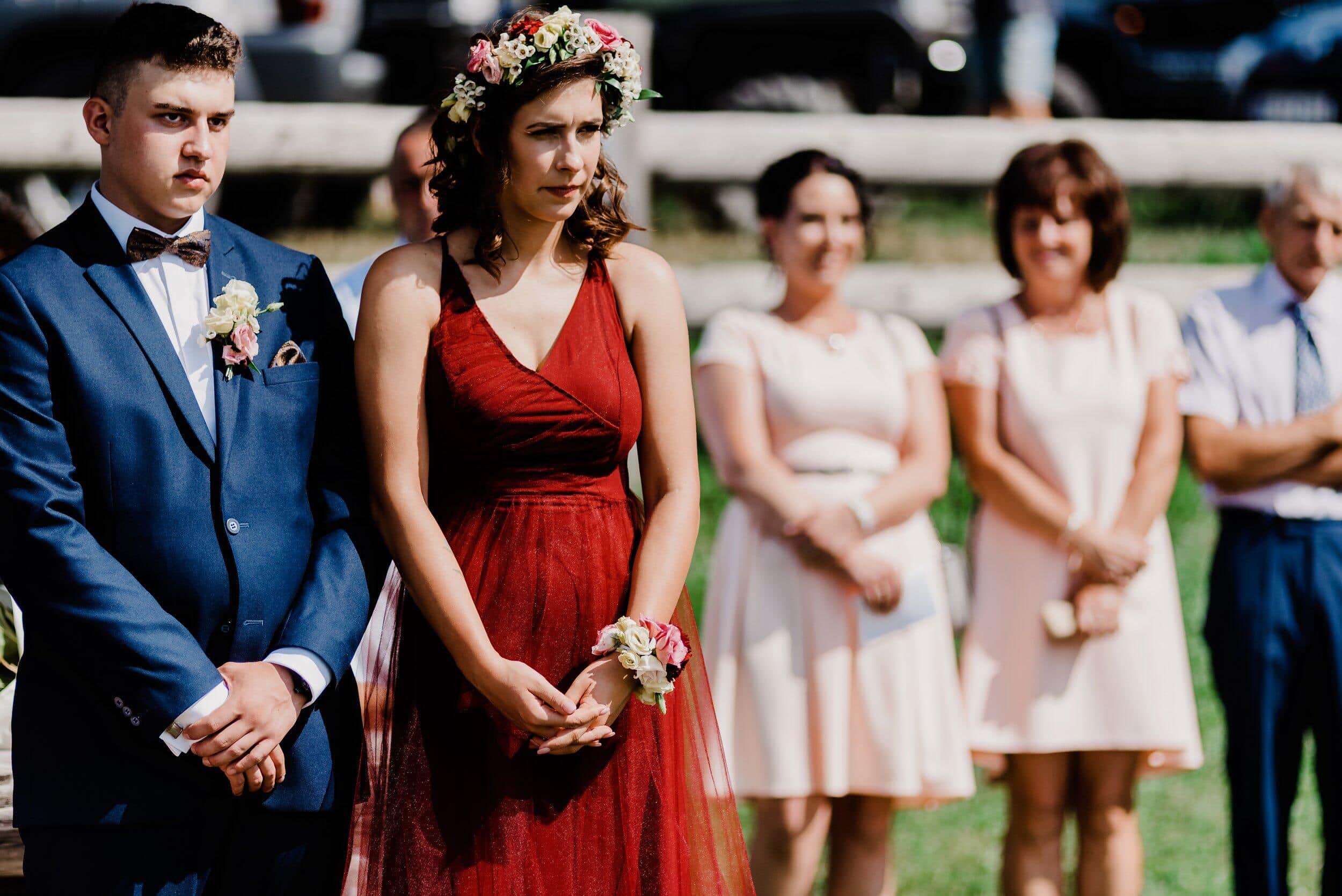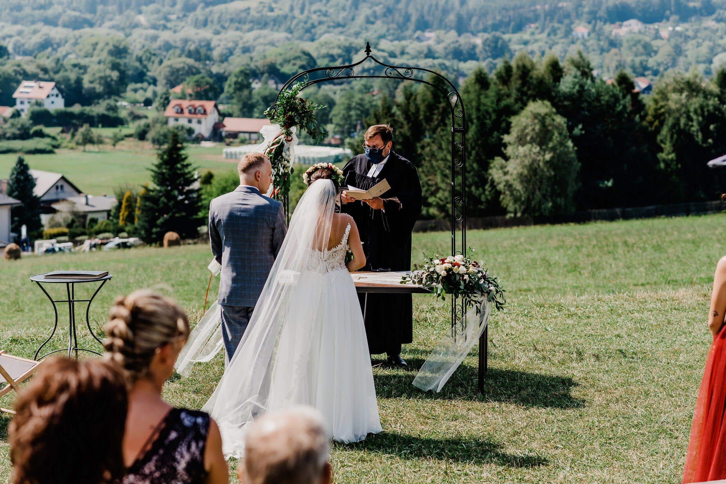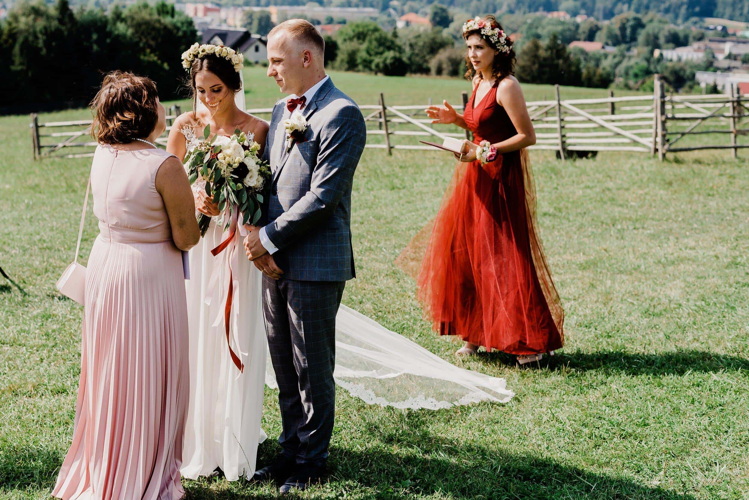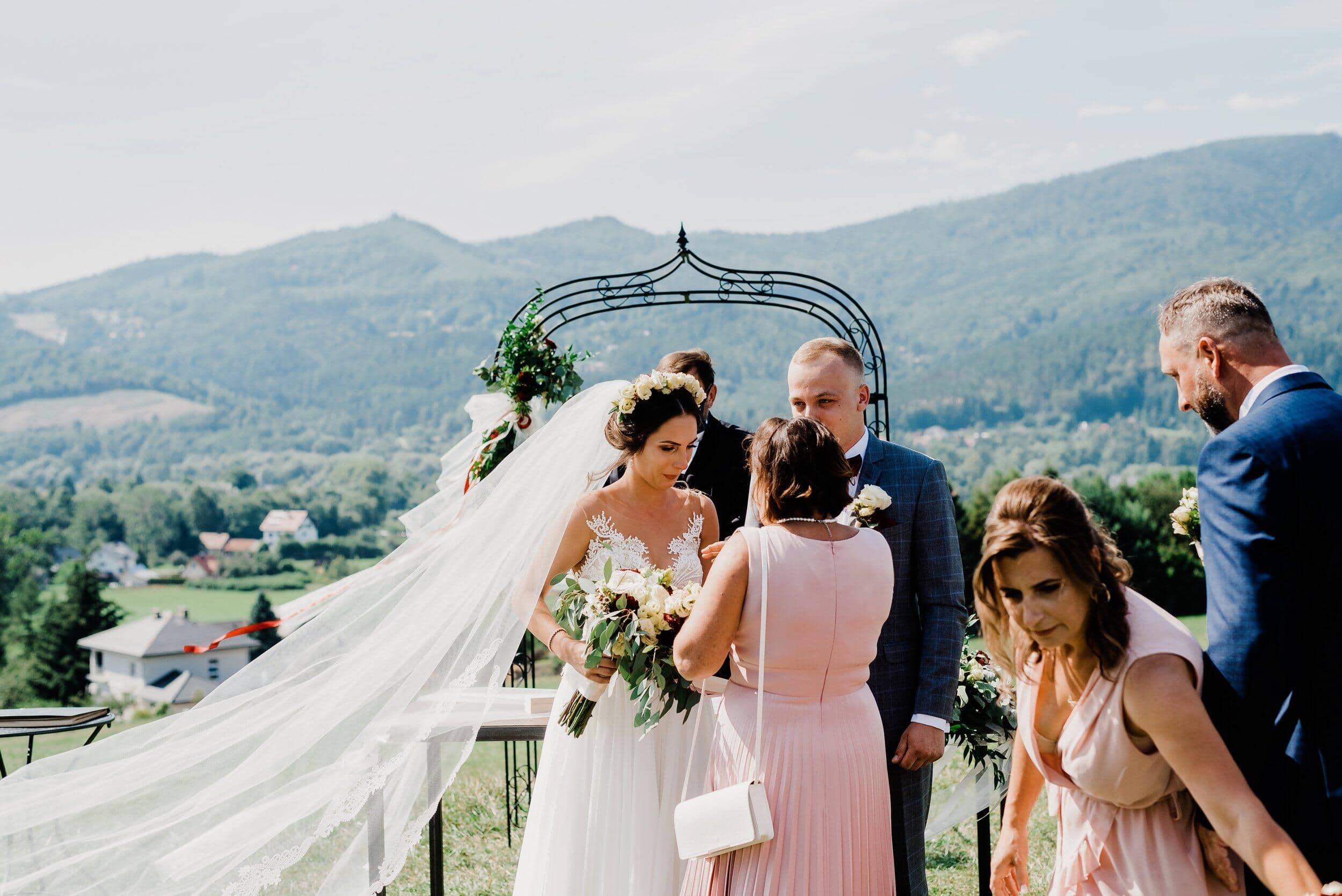 Ceremonia odbyła się na malowniczej polanie przy bacówce w Węgierskiej Górce. Miejsce zapierało dech w piersiach – zielone wzgórza, szczyty i niebo. Delikatny wiatr poruszał welon Edyty, unosząc go jak mgiełkę. Piotrek stał na tle gór, patrząc na nią, jakby właśnie widział spełniające się marzenie. W powietrzu unosił się zapach trawy, a w tle słychać było jedynie szum wiatru i cichy śpiew ptaków.