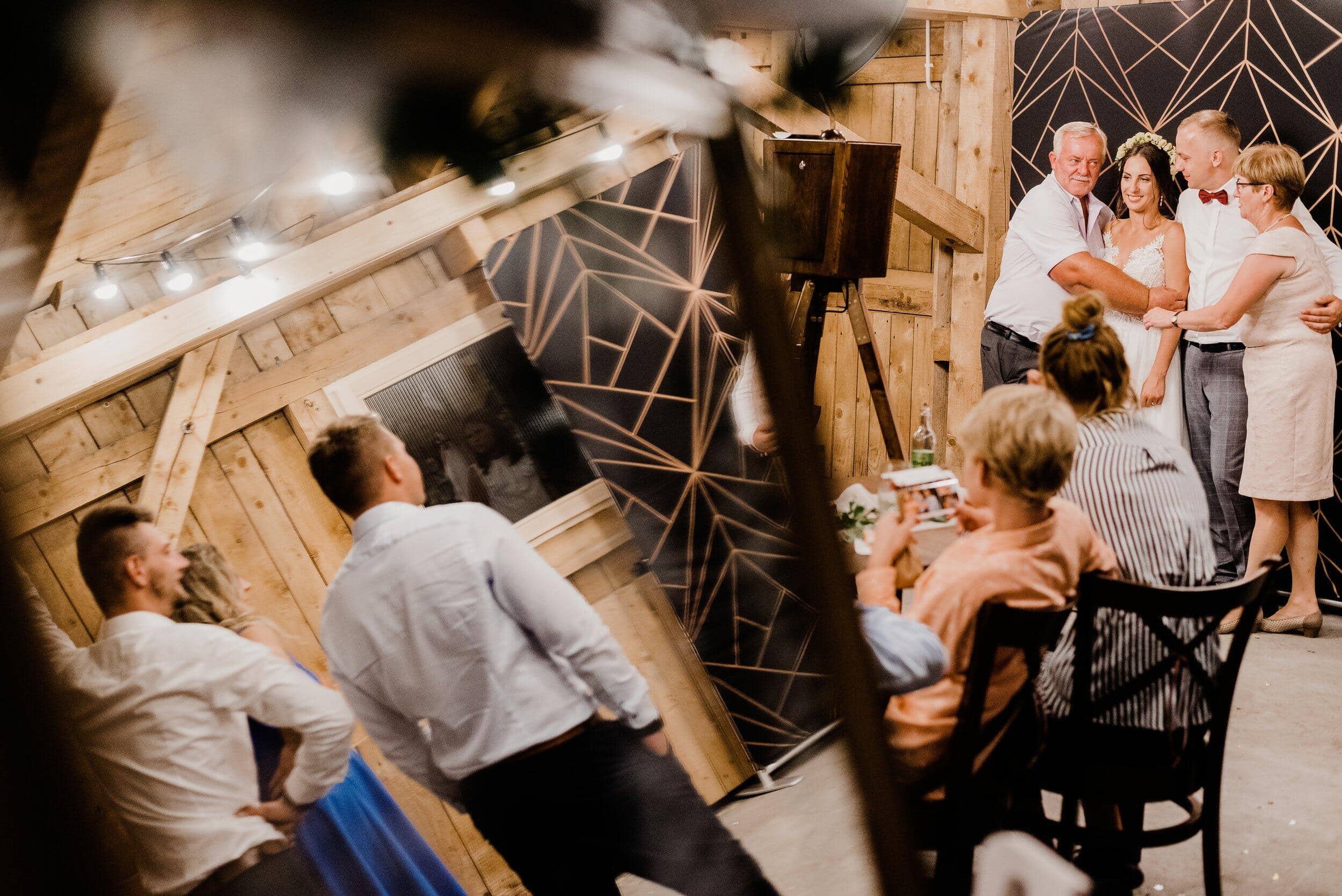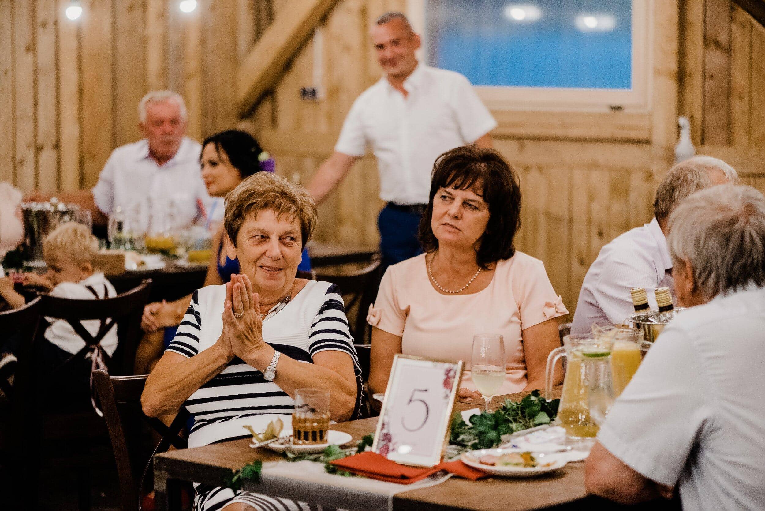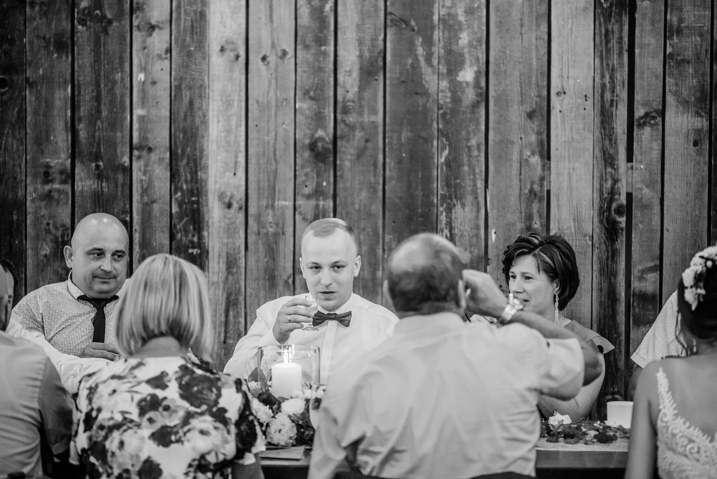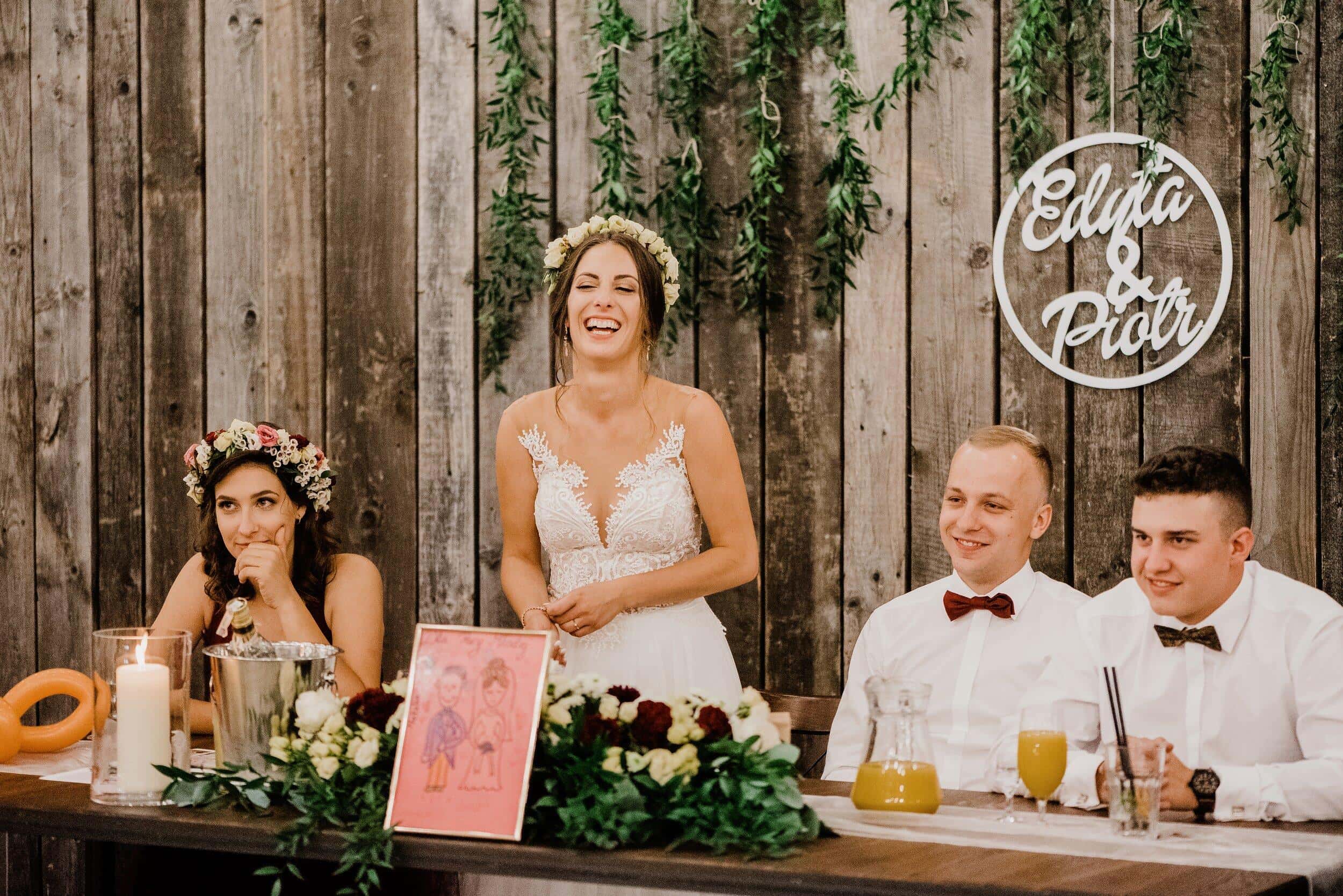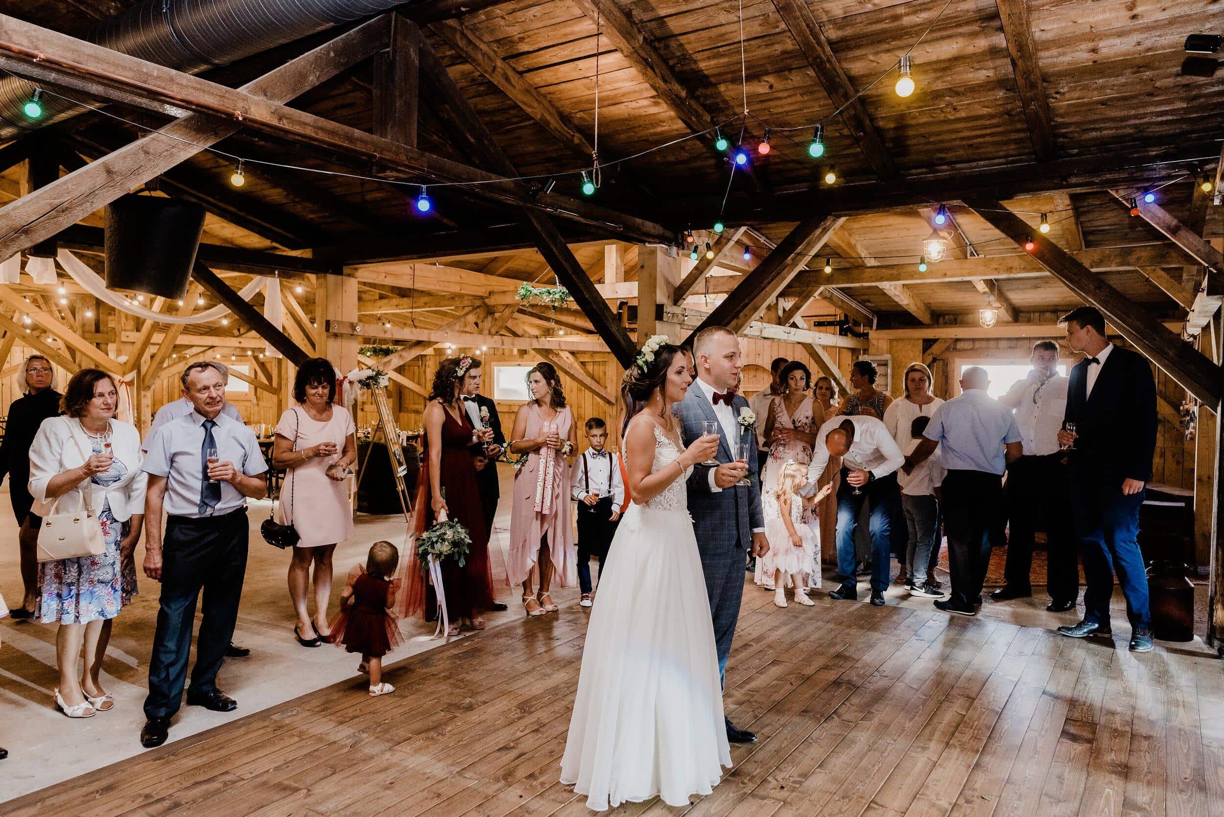 Podczas wesela nie brakowało momentów pełnych ciepła i śmiechu – goście chętnie przechadzali się między stołami, delektując się wiejskimi smakołykami, a dzieci biegały po drewnianej podłodze. Atmosfera była swobodna, wypełniona radosnymi rozmowami i szumem kieliszków wznoszących się w kolejnych toastach za Edytę i Piotrka. Było sielsko, było prawdziwie – bez sztucznej elegancji, za to z ogromem serca i szczerej radości.