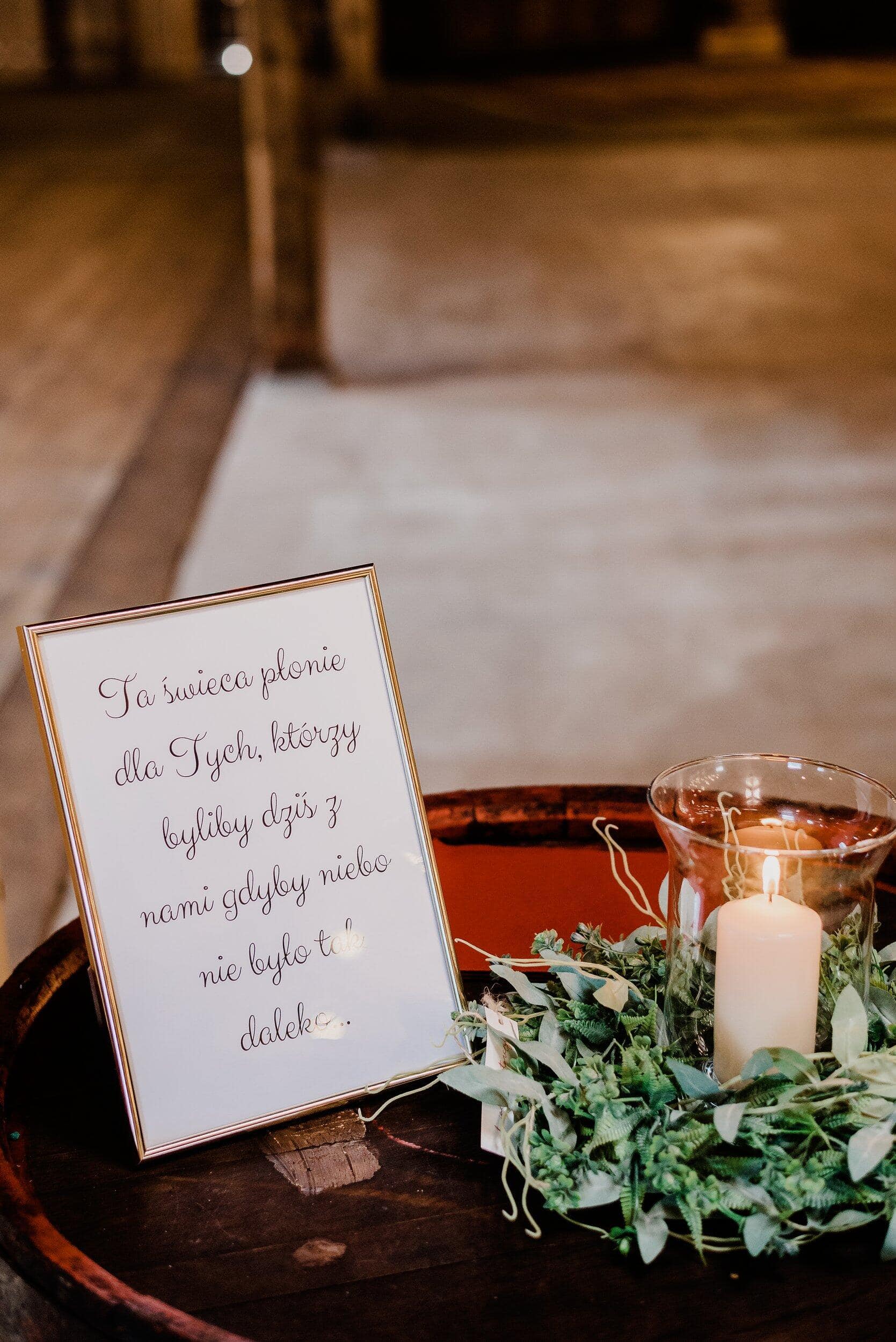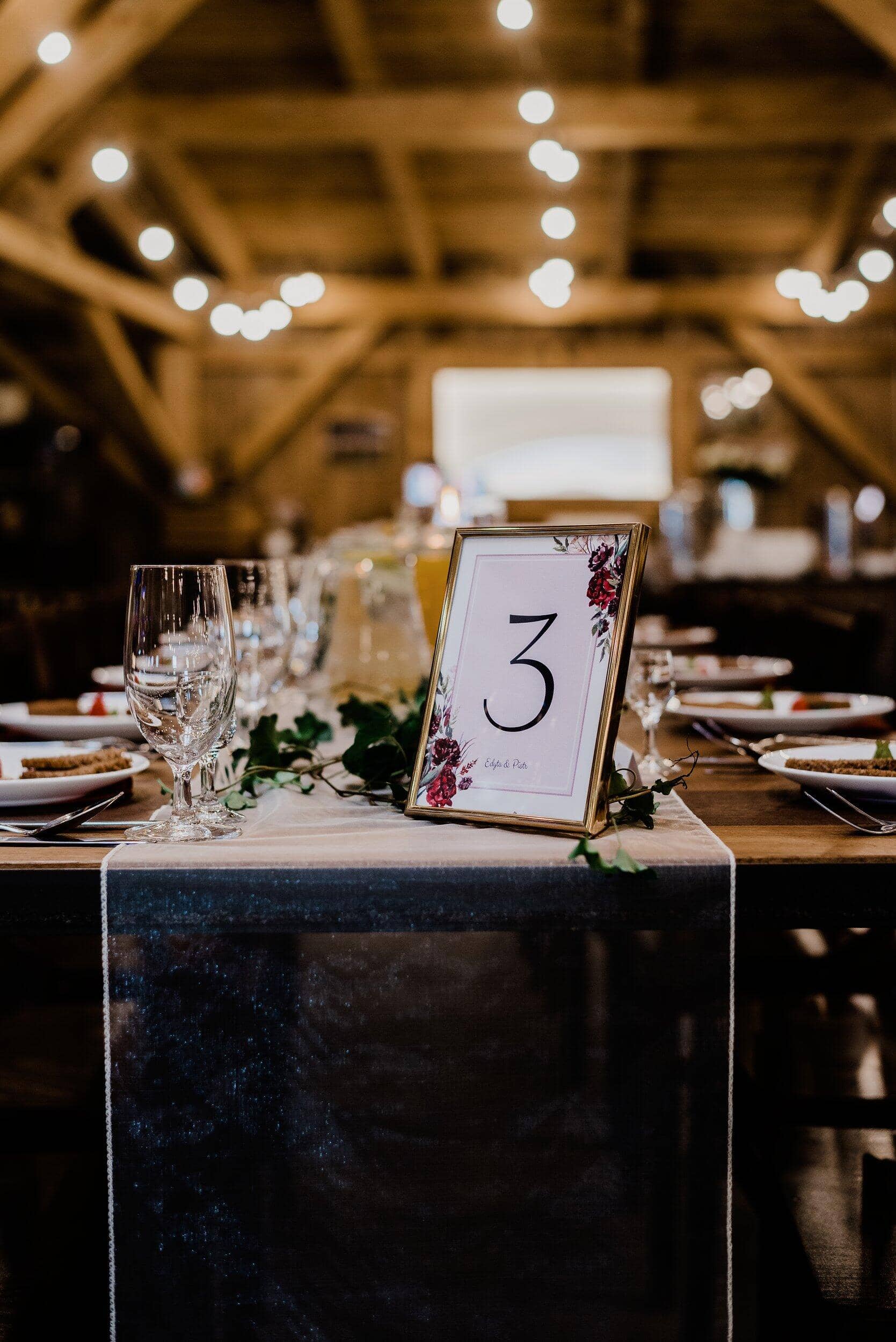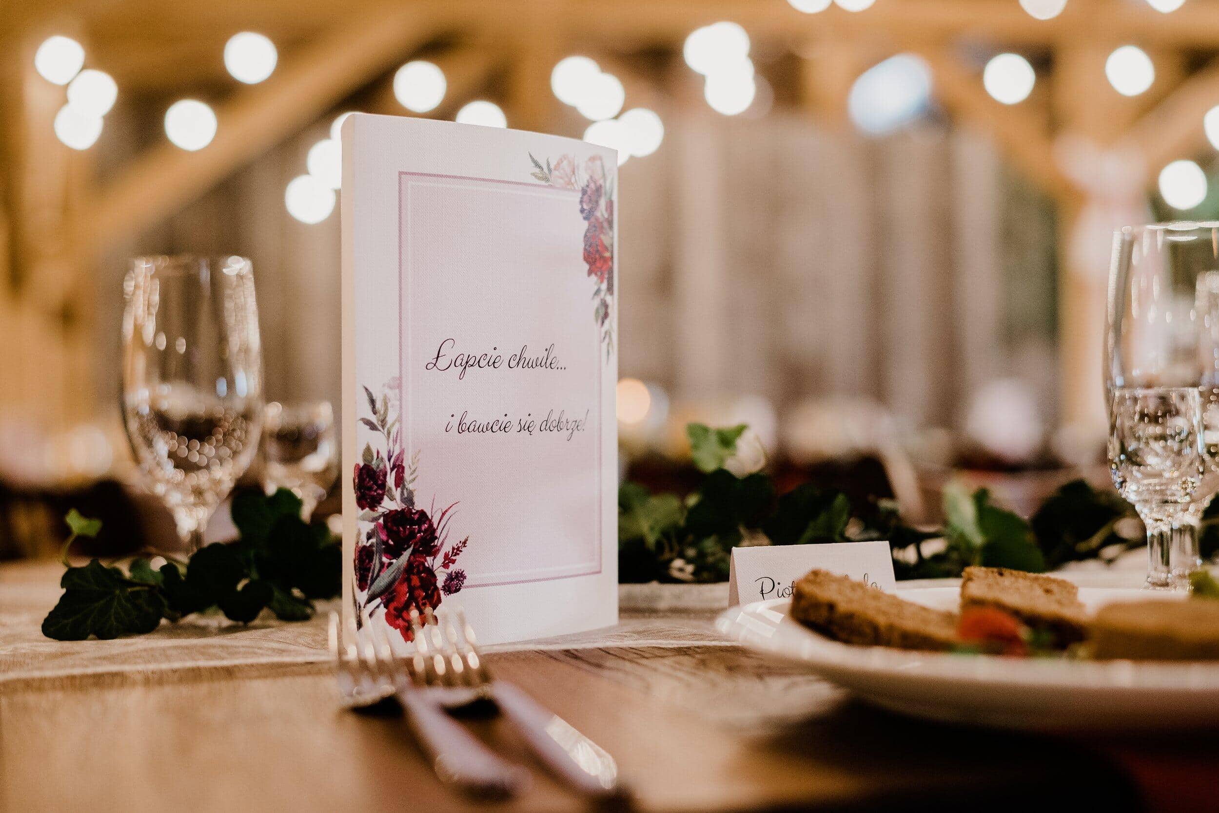 Styl boho i rustykalne akcenty idealnie komponowały się z otoczeniem. Drewniane stoły nakryte lnianymi obrusami, polne kwiaty w wazonach i delikatne świece sprawiały, że każdy czuł się tu swobodnie i jak w domu. Pomiędzy belkami rozciągały się girlandy z drobnymi światełkami, nadające wnętrzu przytulnego blasku. W powietrzu unosił się zapach drewna.