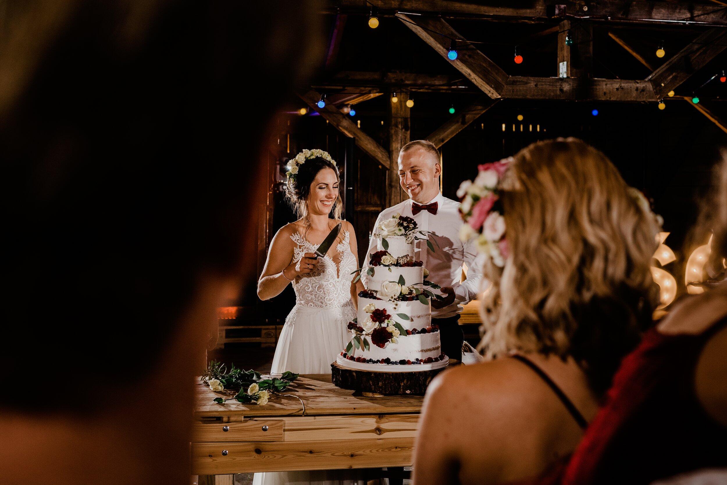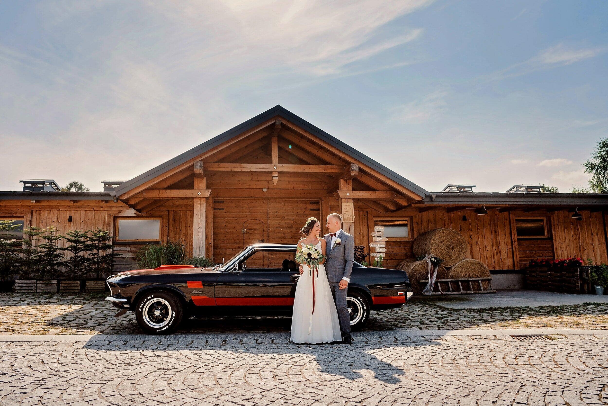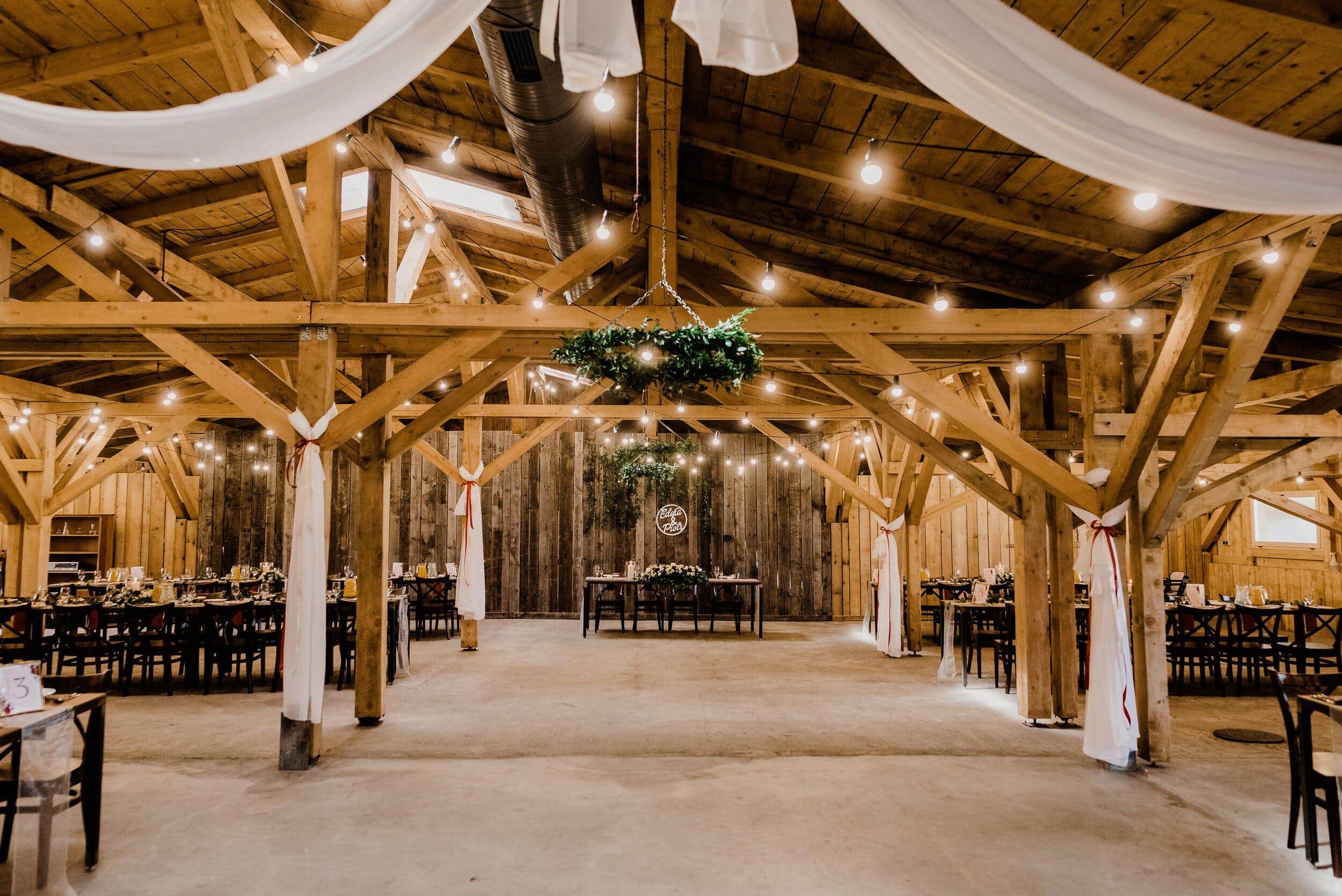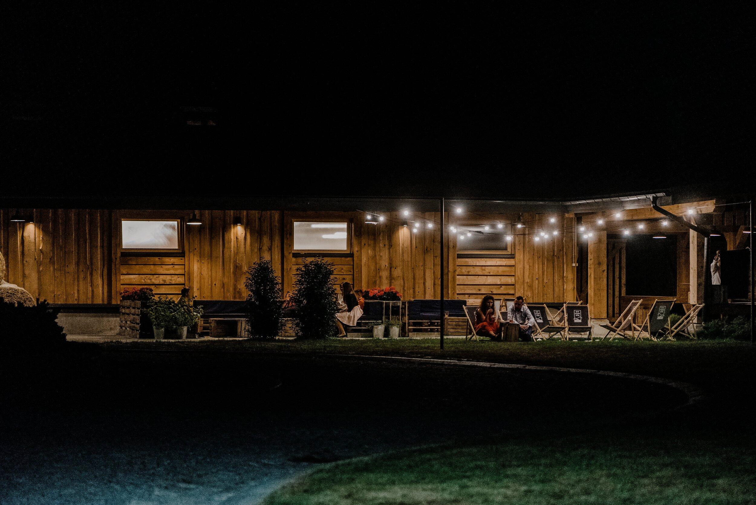 Po wzruszającej ceremonii przyszedł czas na świętowanie – i to nie byle gdzie! Wesele w Owczarni to wybór, który idealnie wpisał się w ich wizję. Położona tuż poniżej polany, Owczarnia to fantastyczne miejsce – drewniana stodoła, rustykalny klimat, surowe drewno i światła girland, które dodają ciepła i intymności.